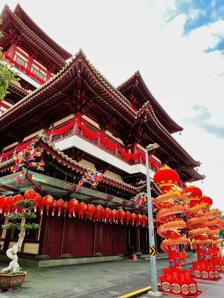 The Buddha Tooth Relic Temple and Museum is known for its stunning four-storey building located in the heart of Chinatown, featuring intricate architectural details and rich cultural heritage. Red lanterns would be put up during festive occasions like the Lunar New Year and Mid Autumn Festivals.